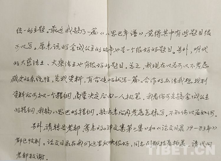 記得我大學畢業(yè)剛到新單位,人生地不熟,加之原來沉浸在“文學夢”中,現(xiàn)在陡然轉到藏族歷史研究,所謂基礎不牢地動山搖,困惑加不適,可想而知。陳老師在聊天中得知我的情況后,談到文史不分家,自己對文學也很有興趣,與青海《瀚海潮》編輯很熟悉。這樣,我遇到一個學識淵博的良師益友,聆聽指教,何其難得。在陳老師的鼓勵和幫助下,我在惶惑中嘗試把歷史與文學結合起來,與他合作發(fā)表了歷史故事新編《長安和親》《香波山奇遇—吐蕃聶墀贊普的故事》等,平穩(wěn)地完成了專業(yè)變動的過渡期。后來,他離開中央民族學院到青海社會科學院工作,我們之間仍堅持信件往來,得到他很多幫助。每一次通信,我們談得最多的都是學術。在某次回信中,他談及下一步合作的工作,特別提到“至于今后如何搞,我想原來定的歷史故事新編計劃似乎是太大了一點。主要從藏族史的系統(tǒng)性考慮,而沒有考慮到現(xiàn)實的需要。所以我想還是先寫主題符合現(xiàn)實需要的題目,寫歌頌民族團結、文化交流,國家統(tǒng)一的主題。最近,我搞了一篇《八思巴年譜》,覺得其中有些題目很可以寫。原來說的金城公主的故事也是一個很好的題目。另外,明代的大慈法王、大乘法王也有很好的題目??傊椰F(xiàn)在認為可以不考慮藏族史的系統(tǒng)性,先找資料,有合適的就寫一篇。合作的辦法我想找到資料后,可擬一個提綱,商量決定后,由一人執(zhí)筆。我看你可先搞金城公主的提綱,我搞八思巴的提綱,搞出來后再考慮怎樣寫,不知你以為如何?!?/p>