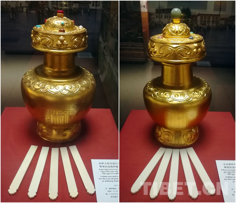 圖左為大昭寺進(jìn)行金瓶掣簽的金瓶和象牙簽(復(fù)制品),圖右為雍和宮進(jìn)行金瓶掣簽的金瓶和象牙簽(復(fù)制品)。攝影:李元梅