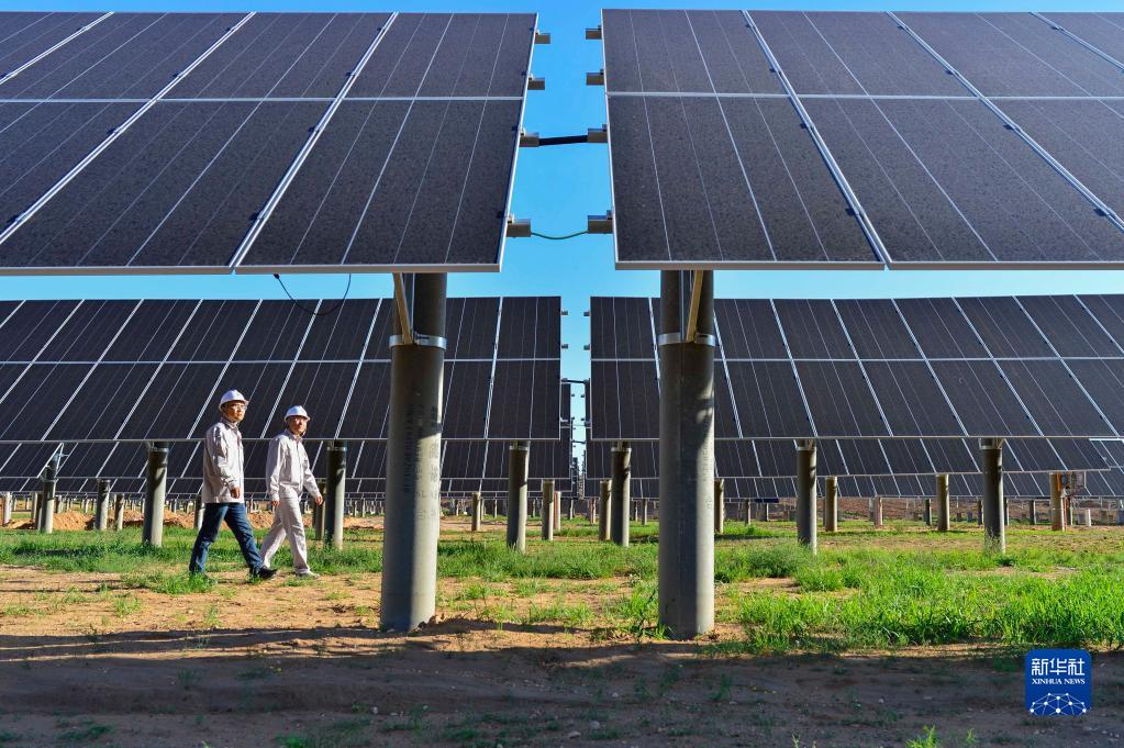 工作人員在內蒙古自治區(qū)鄂爾多斯市伊金霍洛旗天驕綠能50萬千瓦采煤沉陷區(qū)生態(tài)治理光伏發(fā)電示范項目區(qū)里巡查(2021年7月8日攝)。 新華社發(fā)(王正 攝)