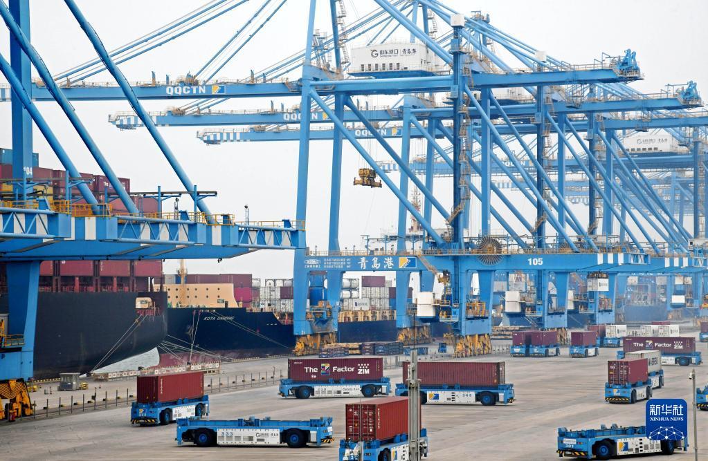 作業(yè)中的山東港口青島港全自動(dòng)化集裝箱碼頭(10月16日攝)。新華社記者 李紫恒 攝