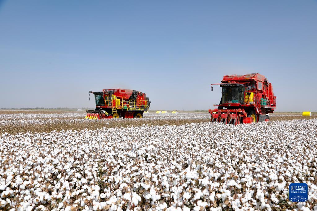 在新疆巴音郭楞蒙古自治州尉犁縣興平鎮(zhèn)統(tǒng)其克村,兩臺(tái)國產(chǎn)采棉機(jī)在采收棉花(2022年9月30日攝)。新華社發(fā)(汪志鵬 攝)