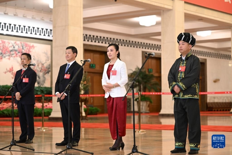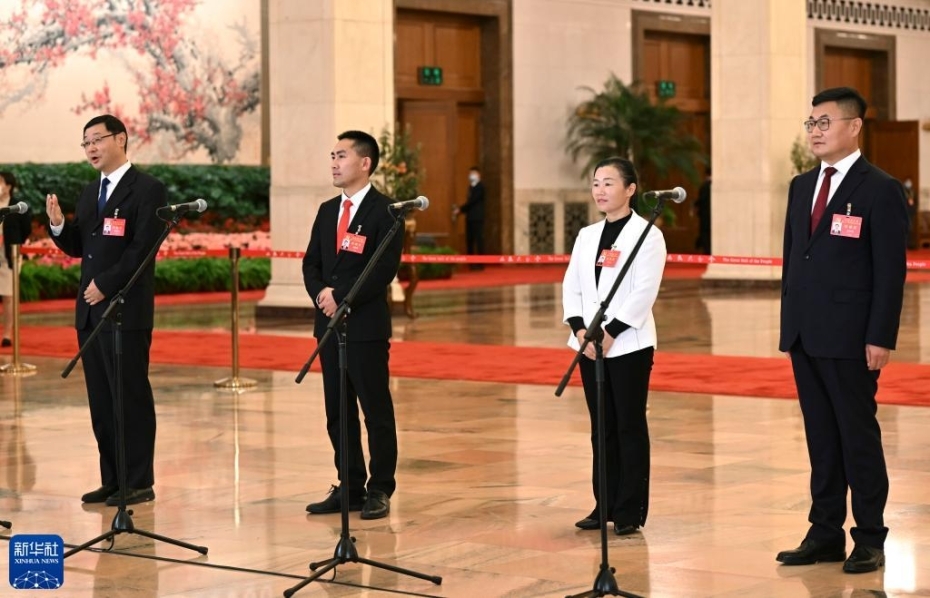 10月22日,中國共產(chǎn)黨第二十次全國代表大會(huì)閉幕會(huì)在北京人民大會(huì)堂舉行。這是閉幕會(huì)后,周海江、李國璋、張燕、施金通代表(自左至右)接受采訪。新華社記者 金良快 攝 圖片來源:新華網(wǎng)