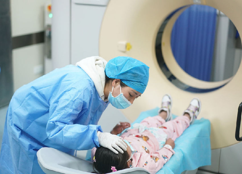 5月12日,南京醫(yī)科大學(xué)第二附屬醫(yī)院的護(hù)士在安慰準(zhǔn)備接受CT增強(qiáng)檢查的小患者。新華每日電訊記者季春鵬攝