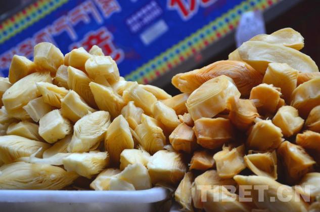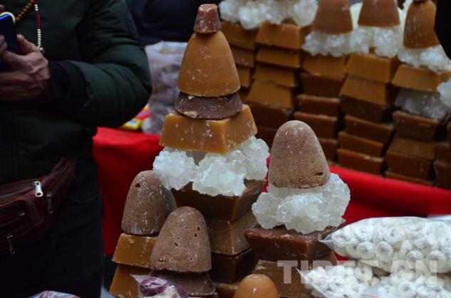 商城一層是一個(gè)年貨市場(chǎng),一層一層壘起來(lái)的切瑪盒、不同顏色和形狀的卡塞、堆成寶塔形狀的紅糖、花盆里裝著的青稞苗……在那拿出皮尺量的,是在購(gòu)買(mǎi)香布,藏歷新年到來(lái)時(shí)家家戶(hù)戶(hù)都會(huì)更換新的香布。