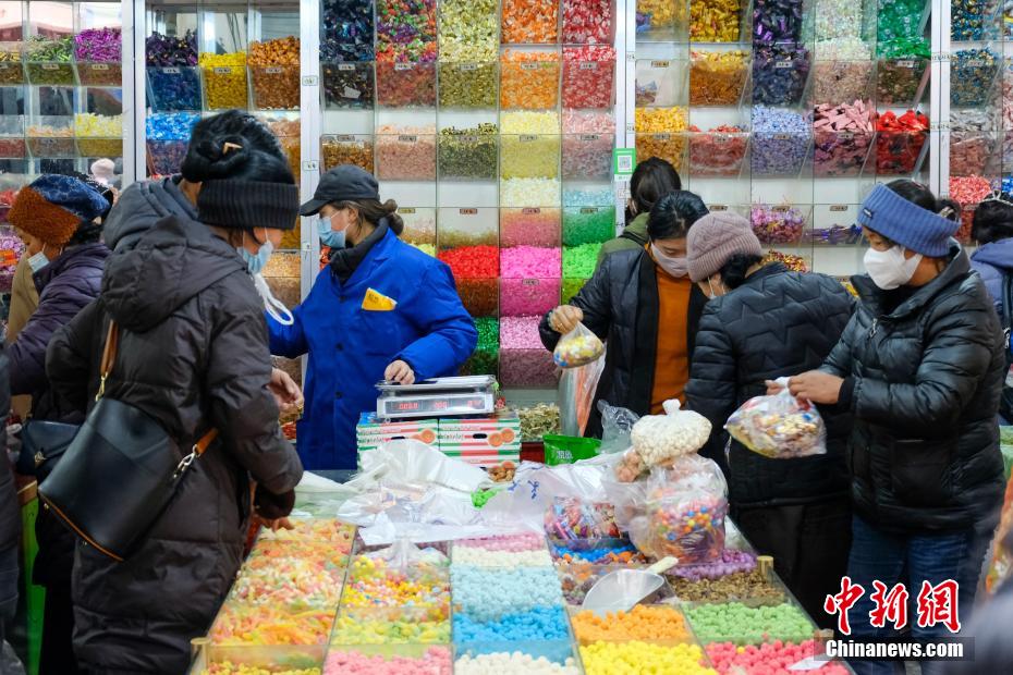 目前正值藏歷12月下旬,西藏即將迎來傳統(tǒng)藏歷水虎新年,拉薩民眾也全面進(jìn)入“藏歷新年時(shí)間”。2月27日下午,小新在西藏最大的傳統(tǒng)綜合市場(chǎng)——拉薩沖賽康市場(chǎng)周邊看到,羅薩美朵、卡塞、酥油、切瑪盒、糖果、干果、藏式服裝等年貨琳瑯滿目,購(gòu)買的市民也進(jìn)入“最后”的采購(gòu)時(shí)間,市場(chǎng)周圍人群絡(luò)繹不絕,高原迎春、年味十足。圖為一商販在拉薩沖賽康市場(chǎng)周邊銷售藏歷新年年貨“褪”。江飛波 攝