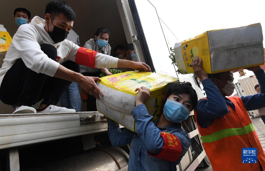2020年3月3日,在廣西南寧國際鐵路港,南寧車務(wù)段“青年突擊隊(duì)”隊(duì)員黃瑩瑩(右二)在搬運(yùn)廣西馳援湖北物資。新華社記者 陸波岸 攝