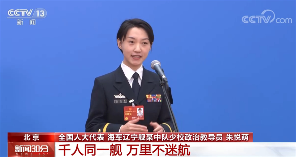 全國人大代表 海軍遼寧艦某中隊少校政治教導員 朱悅萌:這10年里,我們遼寧艦從下水啟航、戰(zhàn)機上艦到遠海部署,正在繪就大國重器更加深遠、更加壯闊的奔涌航跡,我們把青春夢想融入祖國的航母事業(yè),千人同一艦,萬里不迷航,艦艏行處是長城,國家利益所至,海軍航跡必達。