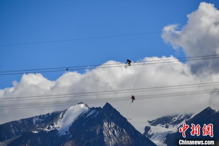 資料圖為2020年6月23日,西藏阿里聯(lián)網(wǎng)工程施工人員在日喀則希夏邦馬雪山附近走線作業(yè)?!〗w波 攝
