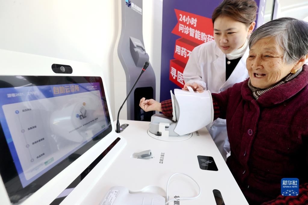 在浙江省湖州市德清縣阜溪街道興山未來社區(qū)居家養(yǎng)老服務(wù)中心,家庭醫(yī)生輔助社區(qū)老人進(jìn)行云問診(2023年2月16日攝)。新華社發(fā)(謝尚國 攝)