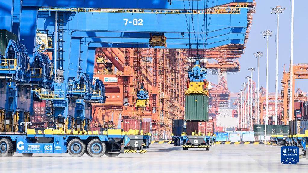 在廣西欽州港自動化集裝箱碼頭,無人駕駛車輛在轉(zhuǎn)運(yùn)集裝箱(2023年2月25日攝)。新華社記者 張愛林 攝