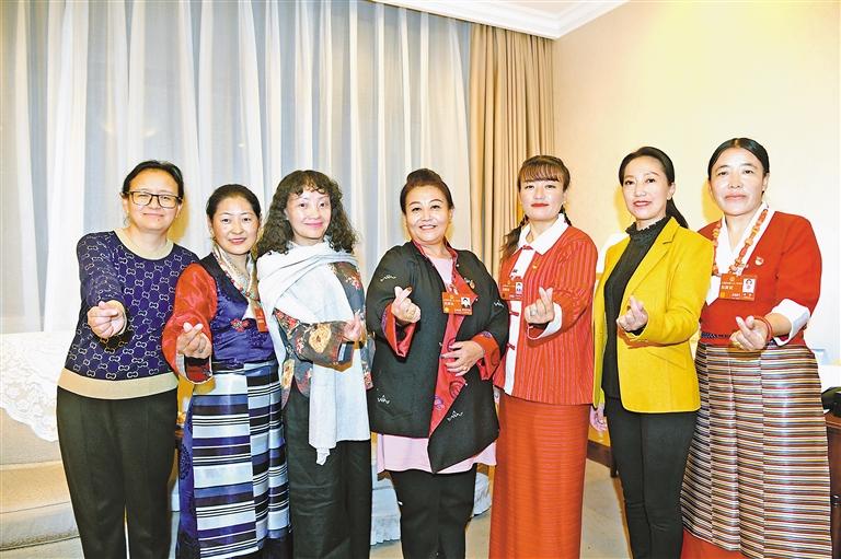 “三八”國(guó)際婦女節(jié)來臨之際,出席十四屆全國(guó)人大一次會(huì)議的西藏女代表在忙碌中迎來自己的節(jié)日。圖為女代表們比心祝福姐妹們節(jié)日快樂。記者 李洲 攝