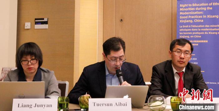 聯(lián)合國人權(quán)理事會第55屆會議期間,中國人權(quán)研究會當?shù)貢r間14日在瑞士日內(nèi)瓦舉辦“現(xiàn)代化發(fā)展中的少數(shù)民族受教育權(quán)——以中國西藏和新疆為例”主題邊會。 圖為中國人權(quán)研究會副秘書長王琰文(圖左)主持邊會。 中新社記者 德永健 攝