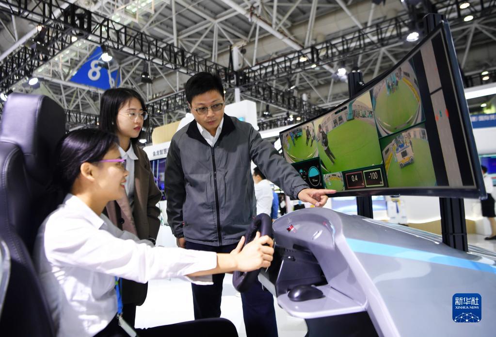 4月26日,在第六屆數(shù)字中國(guó)建設(shè)成果展覽會(huì)上,觀眾體驗(yàn)金龍5G遠(yuǎn)程駕駛。新華社記者 魏培全 攝