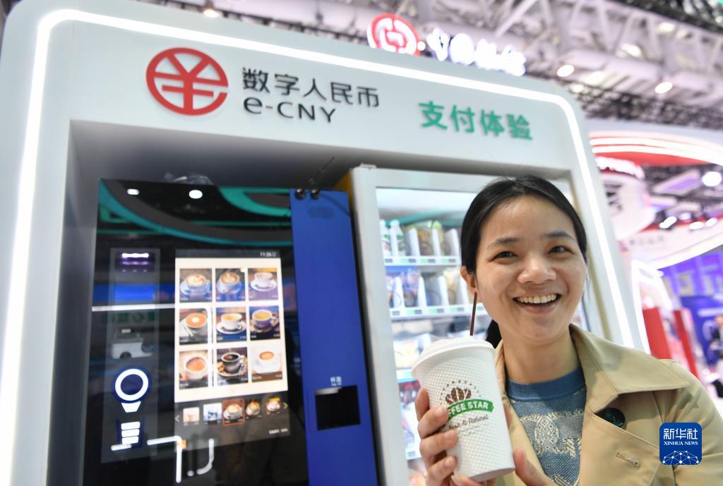 4月26日,在第六屆數(shù)字中國(guó)建設(shè)成果展覽會(huì)現(xiàn)場(chǎng),一名觀眾展示用數(shù)字人民幣購(gòu)買(mǎi)的咖啡。新華社記者 魏培全 攝