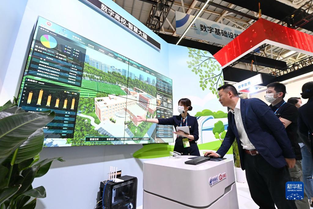 4月26日,數(shù)字福建建設(shè)成果專區(qū)工作人員在展覽現(xiàn)場(chǎng)向參觀者介紹數(shù)字高校智慧大腦綜合管理平臺(tái),該平臺(tái)由福建師范大學(xué)和中國(guó)電信福州分公司聯(lián)手打造。新華社記者 林善傳 攝