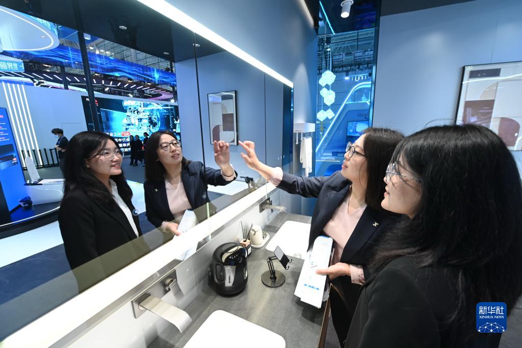 4月26日,參觀者在展覽現(xiàn)場(chǎng)了解支持鴻蒙智聯(lián)的九牧衛(wèi)浴智能產(chǎn)品。新華社記者 林善傳 攝