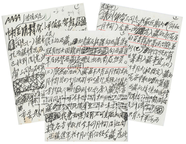 圖為1950年1月2日,毛澤東關(guān)于四月中旬進(jìn)軍西藏問題的建議給中央和彭德懷、鄧小平、劉伯承、賀龍的電報(節(jié)錄)。圖片來源:中央檔案館