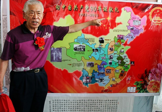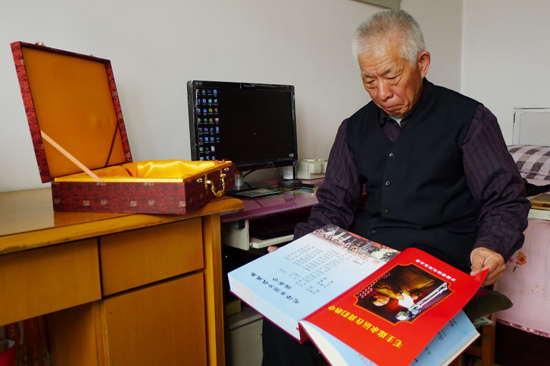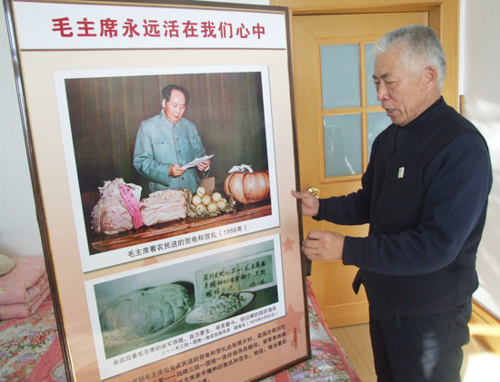 當(dāng)年,梁國忠在38軍114師341團炮一連任指導(dǎo)員的時候,連隊曾榮幸地接受了毛主席轉(zhuǎn)贈的、也是他自己親手播種的南瓜和花生。這一幕,感染了連隊中的每一名戰(zhàn)士,“主席每天日理萬機,還能想著我們這些普通士兵!”看著桌上的南瓜與花生,梁國忠眼中噙滿了淚水。為了記住這段歷史,梁國忠還特意把當(dāng)年毛主席送給他們連隊的“南瓜與花生”的這幅珍貴照片親自給保存了下來。梁國忠說,“每當(dāng)看到這張照片就好像親眼見到了毛主席?!?/p> 立志展遍全中國,永遠不忘毛主席