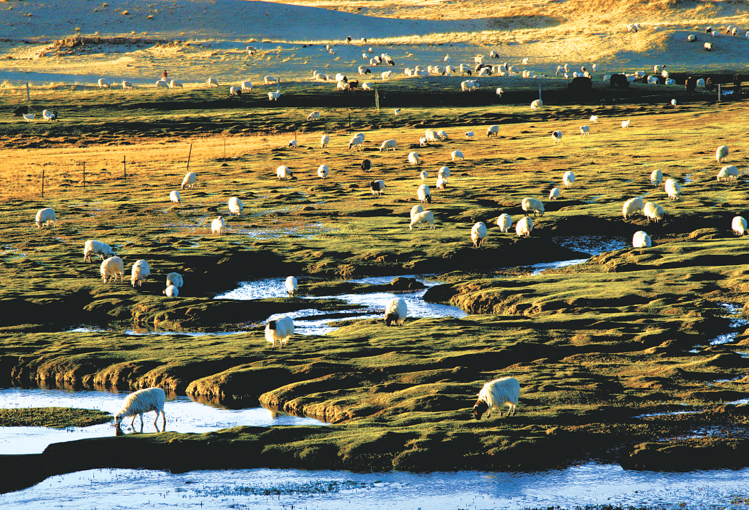 盛夏的金銀灘草原綠草如茵,花開萬頃。草原上,牧民騎著駿馬穿梭在雪白的羊群和棕黑相間的牦牛群間,蓮花般的帳房星星點點地散落在青草和野花叢中,如詩如畫、美不勝收,呈現(xiàn)出人與自然和諧相處的美妙景象。