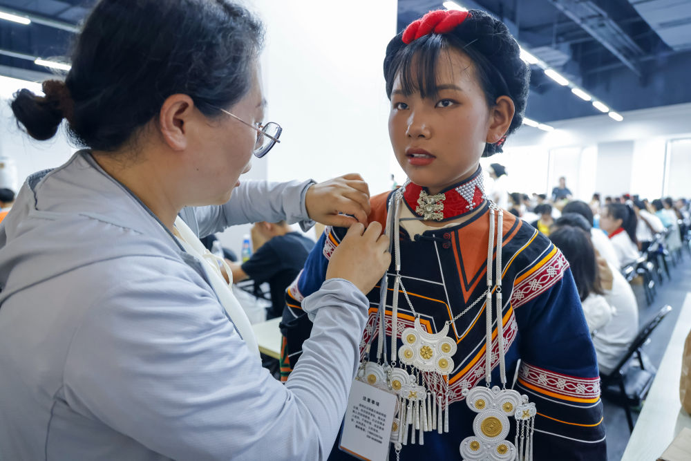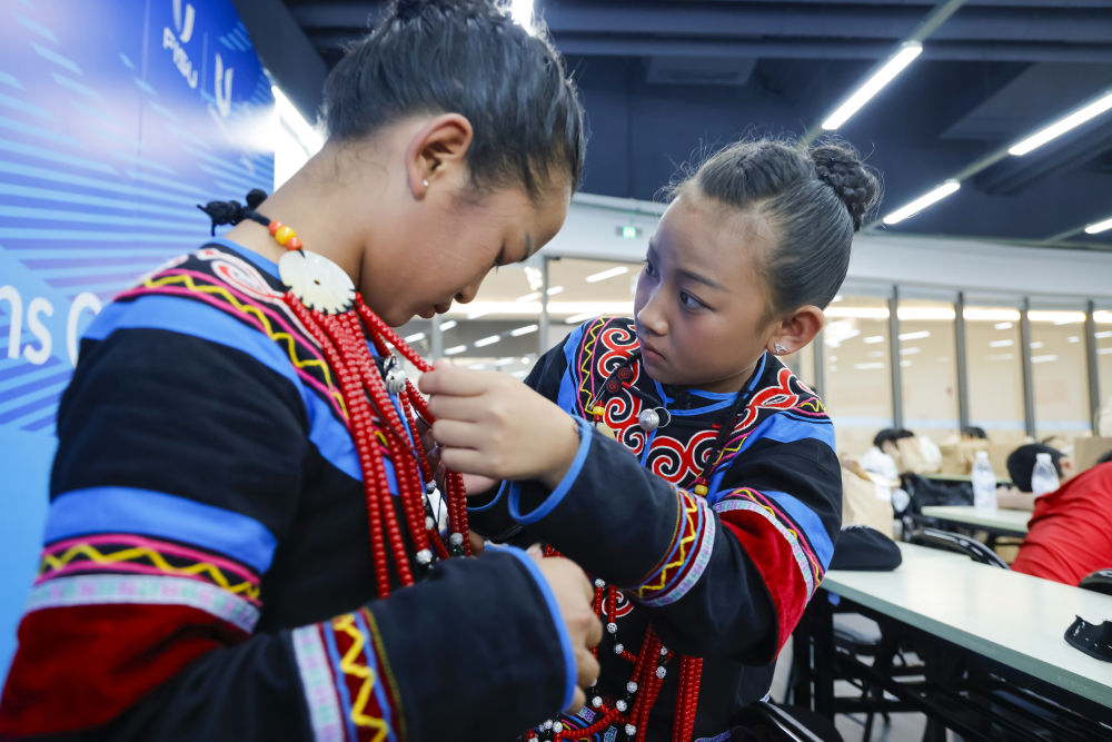 7月23日,在成都大運(yùn)會開幕式彩排之前,吉合拉作(右)幫助俄地惹漢整理飾品。新華社記者沈伯韓 攝