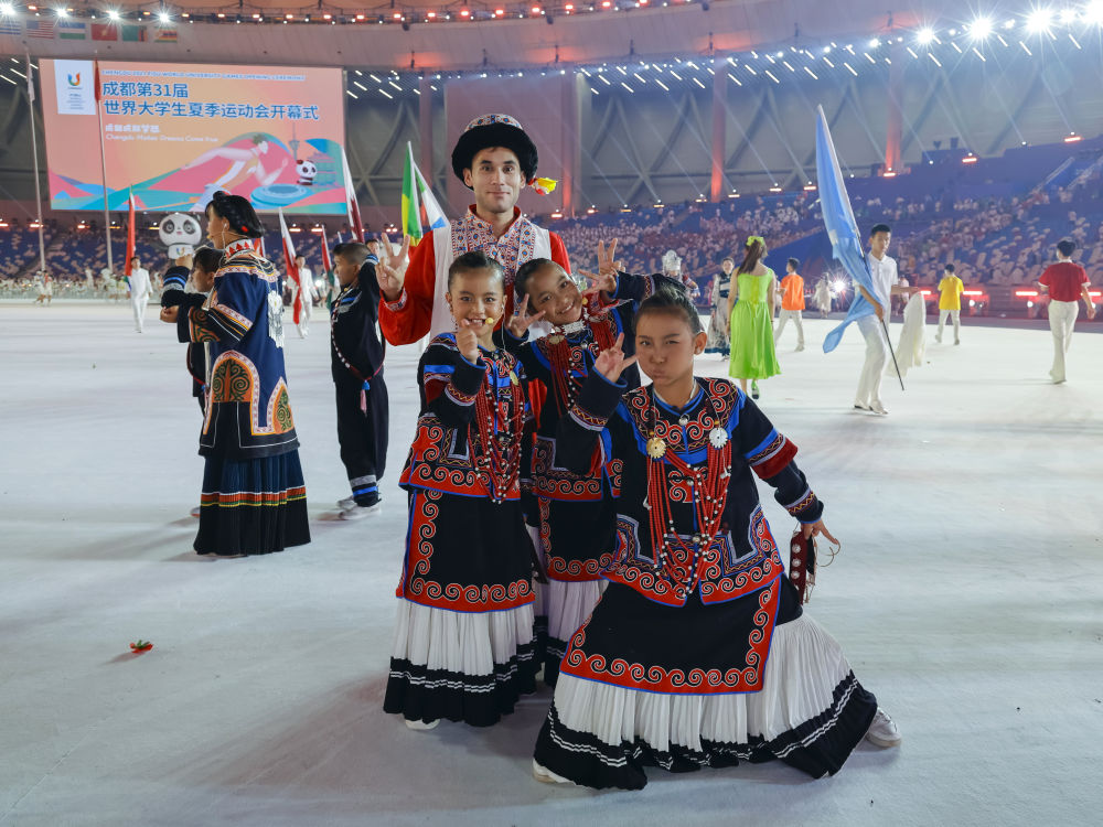 7月23日,在成都大運(yùn)會開幕式彩排結(jié)束后,俄地惹漢、馬杰英和吉和拉作(前左至右)與來自新疆的塔吉克族演員拍攝合影。新華社記者沈伯韓 攝