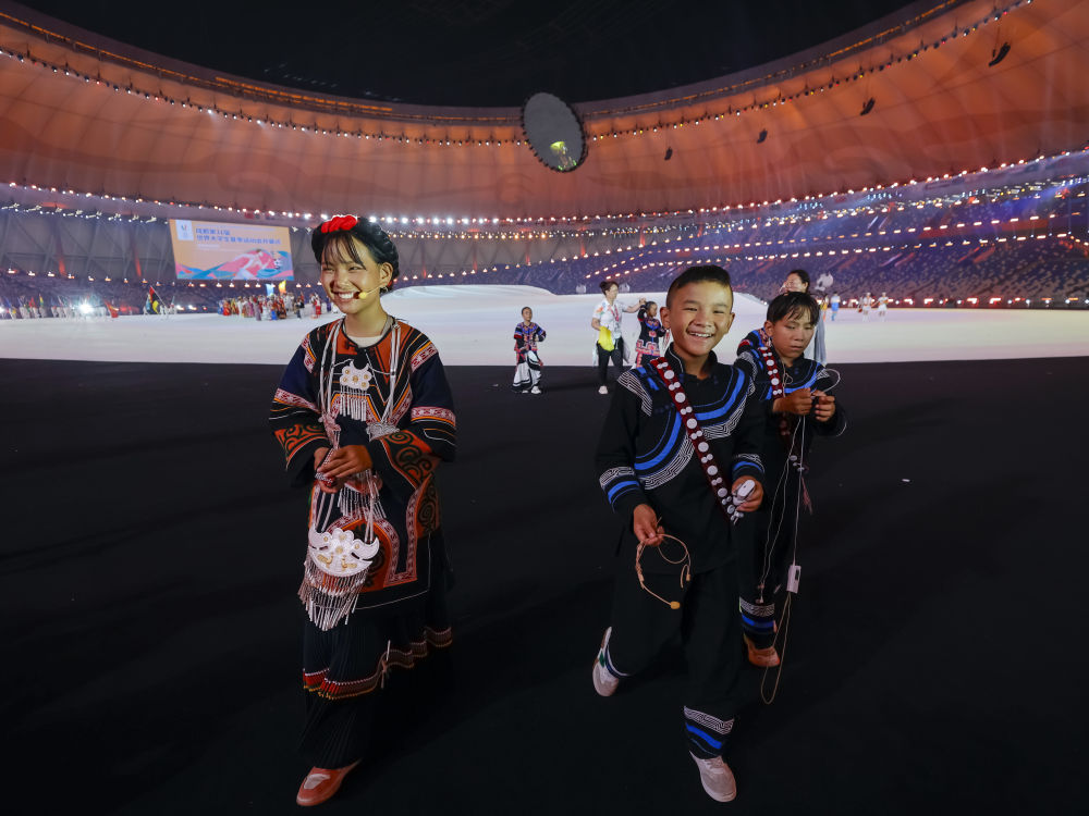 7月28日,來自四川涼山彝族自治州的孩子們在成都大運(yùn)會開幕式上歌唱。新華社記者 江宏景 攝