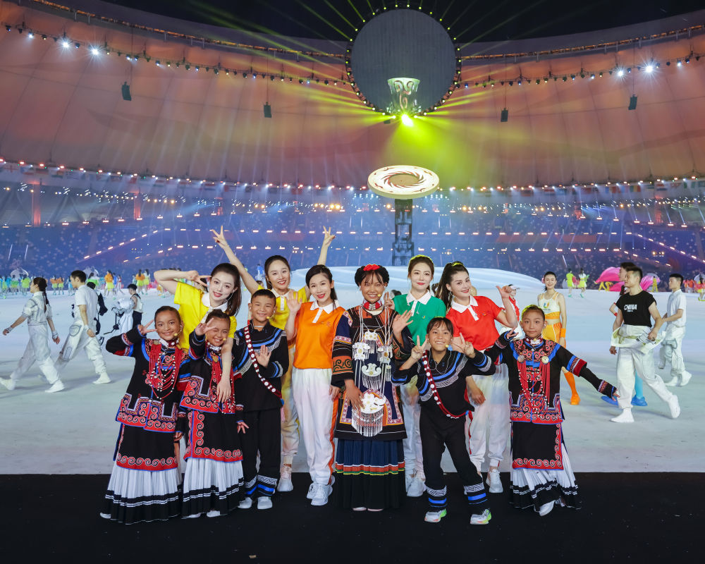 7月23日,成都大運(yùn)會開幕式彩排結(jié)束后,一些演員主動和來自大涼山的孩子們拍攝合影。新華社記者 沈伯韓 攝