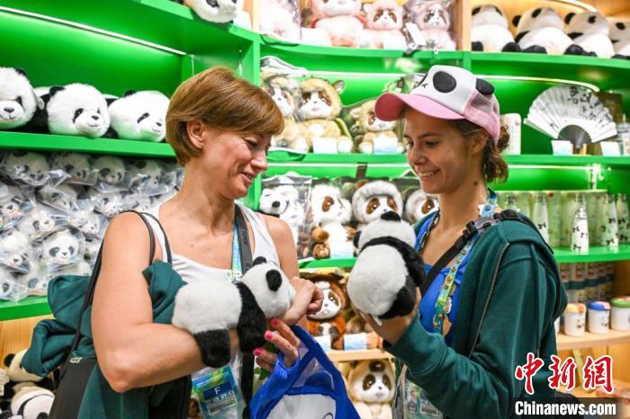 8月1日,成都大運(yùn)會(huì)期間,成都大熊貓繁育研究基地成為參賽代表團(tuán)的熱門(mén)打卡點(diǎn),圖為匈牙利選手凡妮(右)選購(gòu)大熊貓玩偶。中新社記者 趙文宇 攝