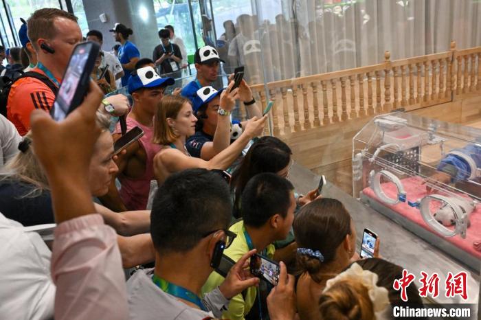8月1日,成都大運(yùn)會(huì)的大學(xué)生運(yùn)動(dòng)員們參觀成都大熊貓繁育研究基地,圖為運(yùn)動(dòng)員圍觀大熊貓幼仔。 中新社記者 趙文宇 攝