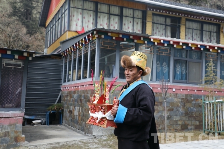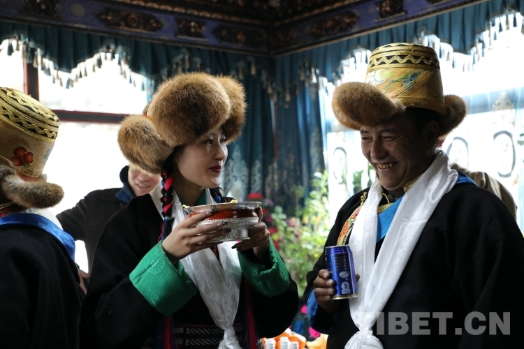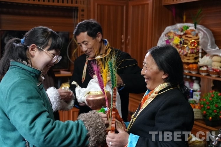 天亮以后,扎西江村一家人穿上新衣服,輪流敬切瑪、喝青稞酒,互道“扎西德勒”。扎西江村家的小女兒達(dá)娃倉決吃切瑪?shù)臅r(shí)候,先用拇指和食指抓起一小撮糌粑灑向空中3次,表示敬天地,然后把糌粑放進(jìn)自己嘴里。喝青稞酒也同樣如此,要先用雙手接過酒杯,然后左手拿杯,右手無名指輕輕地在杯中蘸酒,彈向空中,如此反復(fù)三次。