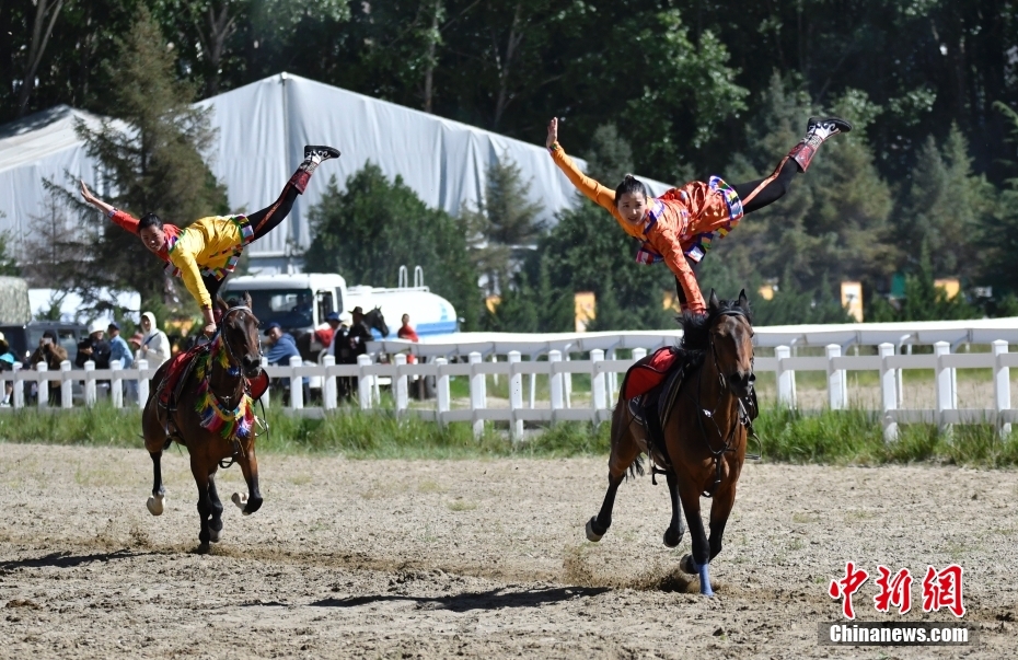 8月17日,騎手們進行馬術表演。當日,2023年拉薩雪頓節(jié)民族傳統(tǒng)馬術表演在西藏拉薩市北郊賽馬場舉行。