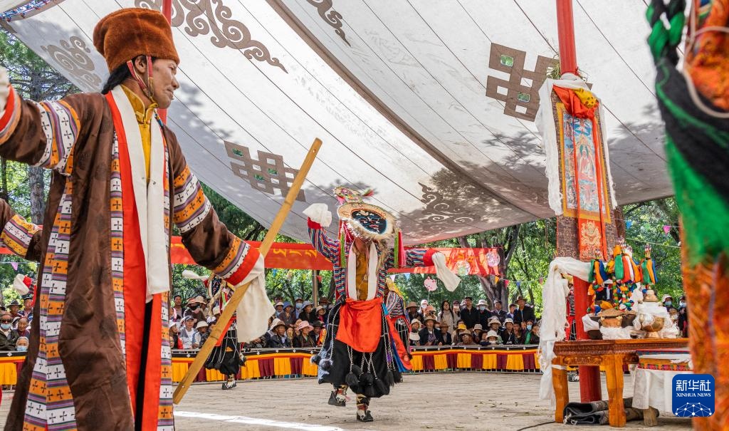 8月19日,在拉薩市羅布林卡園林內(nèi),貢嘎縣乃薩藏戲隊在表演藏戲《朗薩雯崩》。新華社發(fā)(丁增尼達攝)