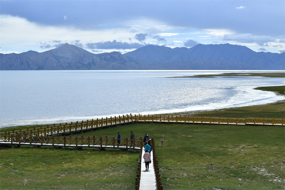 游客行走在青海省果洛藏族自治州瑪多縣冬格措納湖岸畔的木棧道上(2022年8月14日)。新華社發(fā)(卡婭梅朵 攝)