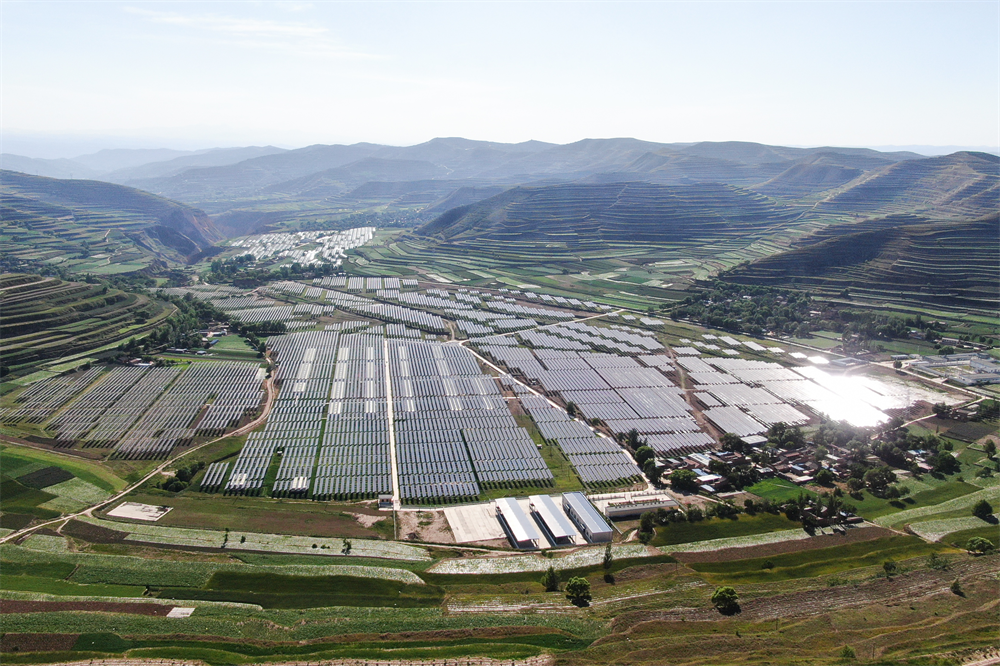 這是2022年6月15日在甘肅省定西市通渭縣榜羅鎮(zhèn)四新村拍攝的集中式光伏電站(無人機(jī)照片)。新華社記者 馬希平 攝
