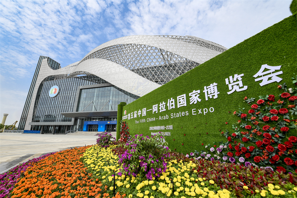 這是2021年8月18日拍攝的第五屆中國-阿拉伯國家博覽會開幕大會會址——寧夏國際會堂外景。新華社記者 馮開華 攝