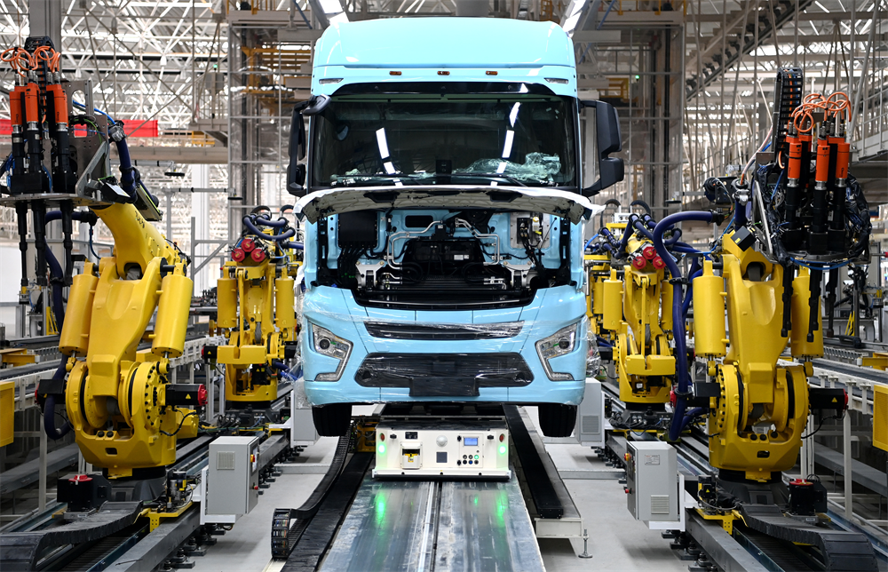 在陜汽重卡擴(kuò)能項目現(xiàn)場,一輛重卡在汽車總裝生產(chǎn)線輪胎自動化裝配擰緊無人工作站進(jìn)行裝配(2022年9月27日攝)。新華社記者 劉瀟 攝