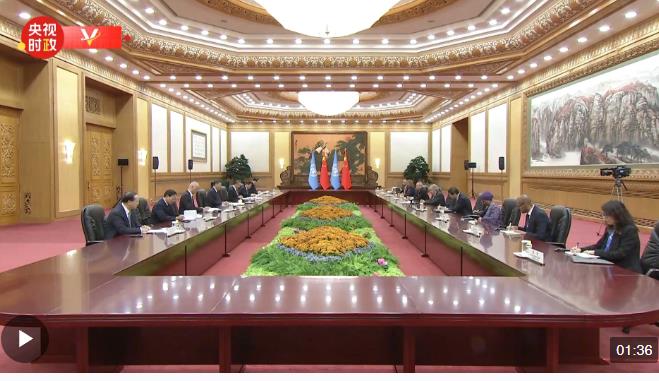 10月18日晚,國(guó)家主席習(xí)近平在人民大會(huì)堂會(huì)見(jiàn)來(lái)華出席第三屆“一帶一路”國(guó)際合作高峰論壇的聯(lián)合國(guó)秘書長(zhǎng)古特雷斯?!?