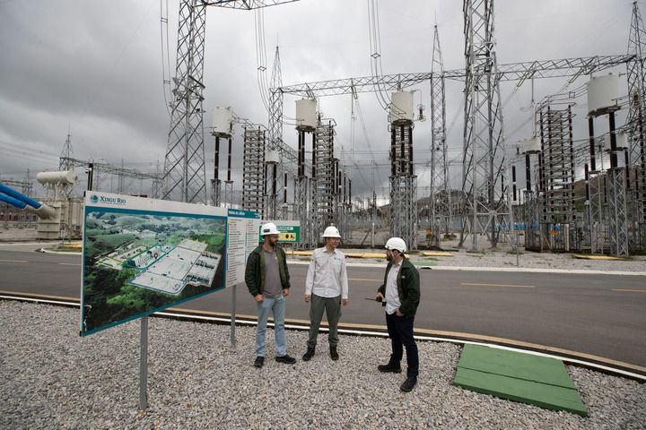 2022年9月30日,在巴西里約熱內盧美麗山特高壓輸電二期項目里約換流站,國網巴控公司換流站運維主管(中)和巴方人員交談。新華社記者 王天聰 攝