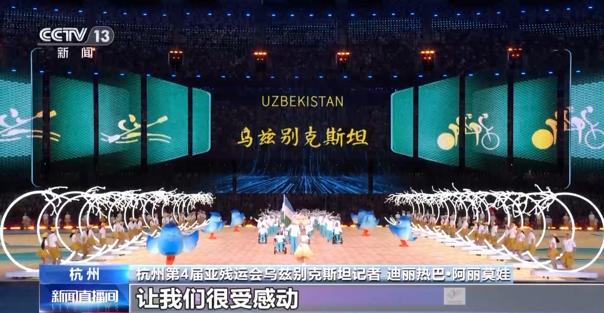 杭州第4屆亞殘運會烏茲別克斯坦記者 迪麗熱巴 阿麗莫娃:當我們國家的代表團入場時受到了全場熱情的歡迎,讓我們很受感動,烏茲別克斯坦和中國是最好的朋友。我們的總統(tǒng)最近在北京參加了“一帶一路”國際合作高峰論壇。我們與中國有很多的合作項目,我相信我們兩國的友誼和在各個領域的合作未來將一直持續(xù)下去。