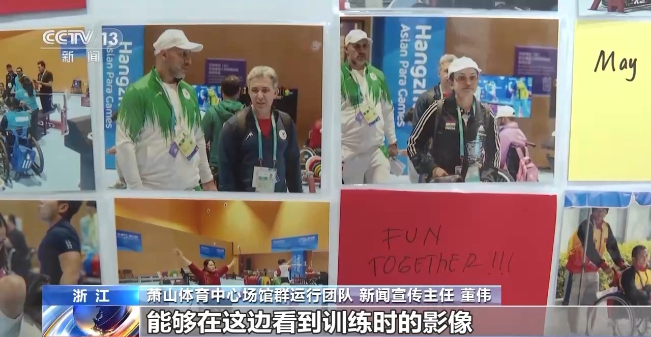 杭州蕭山體育中心體育館,是杭州第4屆亞殘運(yùn)會舉重項(xiàng)目的比賽場館,10月23日,舉重項(xiàng)目已經(jīng)在這里正式開賽。場館的工作人員為了給運(yùn)動員放松心情,并鼓勵他們比賽,特意制作了一面照片墻。
