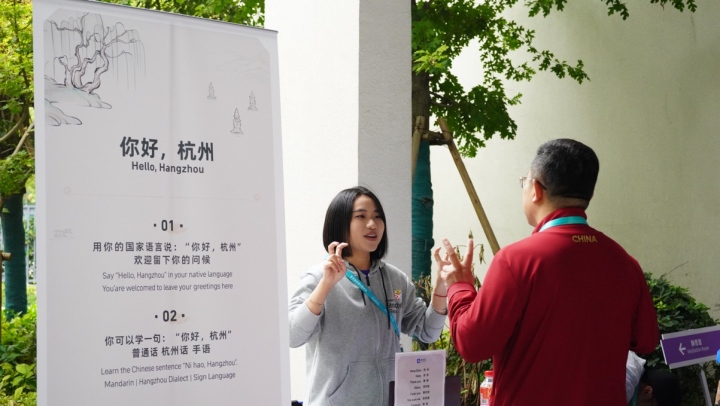 為了幫助各國(guó)運(yùn)動(dòng)員了解中國(guó)文化、了解杭州,體驗(yàn)區(qū)現(xiàn)場(chǎng)設(shè)置了學(xué)中文趣味體驗(yàn)環(huán)節(jié)。體驗(yàn)者只要跟著志愿者現(xiàn)場(chǎng)學(xué)說(shuō)十個(gè)諸如“杭州”、“西湖龍井”、 “片兒川”等簡(jiǎn)單詞匯,或者學(xué)用手語(yǔ)打出相關(guān)詞匯,就可以獲得以西湖美景為主題的紀(jì)念徽章。