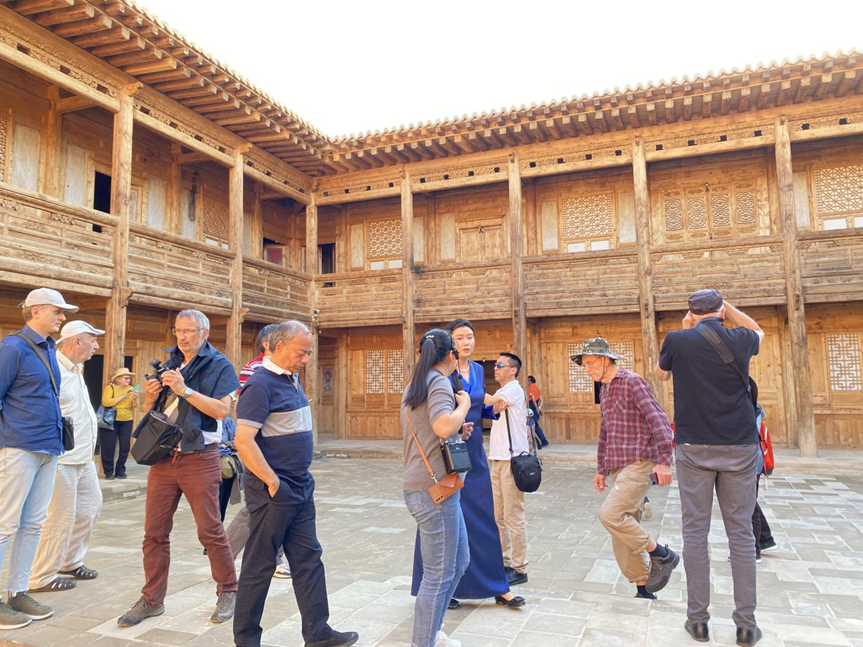 中午,調(diào)研組在黃南藏族自治州尖扎縣噶達(dá)莊園品嘗了藏族美食??勺匪莅倌隁v史的噶達(dá)莊園是當(dāng)?shù)毓爬藗}(cāng)活佛的故居后花園,園內(nèi)樹木茂密、鳥語(yǔ)花香,海外學(xué)者們紛紛表示,在這個(gè)充滿歷史文化氛圍的莊園用餐是一次難忘的體驗(yàn)。下午,調(diào)研組一行參觀了尖扎縣昂拉鄉(xiāng)昂拉千戶府和昂拉賽康寺。昂拉千戶府始建于清代,1941年重建,1949年竣工。莊園占地面積約4600平方米,是青海省保留比較完整的藏式莊園。該莊院建筑風(fēng)格獨(dú)特,前院用木質(zhì)結(jié)構(gòu)建造,后院用土木結(jié)構(gòu)建造,其整體建筑風(fēng)格采用了漢式山水元素。