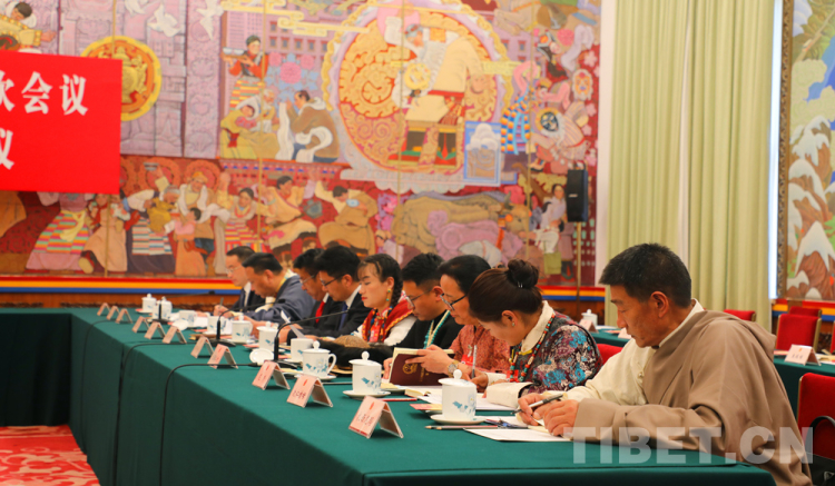 圖為扎西江村(右四)參加十四屆全國人大二次會議西藏代表團(tuán)開放團(tuán)組會議 攝影:桑吉