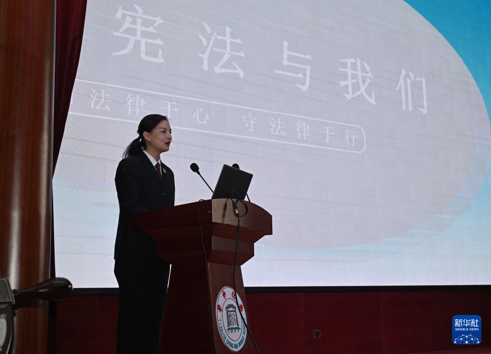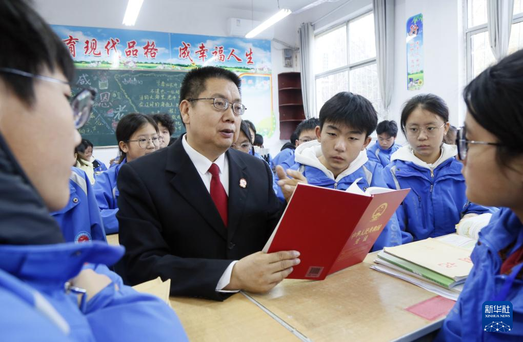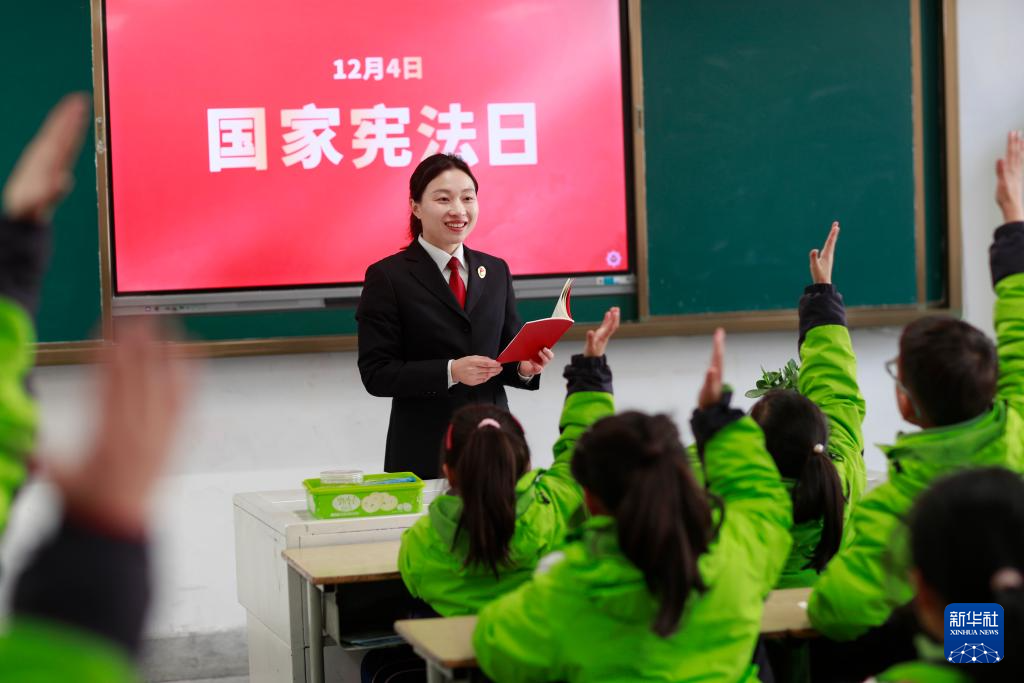 12月3日,河南省洛陽市汝陽縣人民法院法官為縣直屬初級中學學生講解新中國憲法發(fā)展歷程。