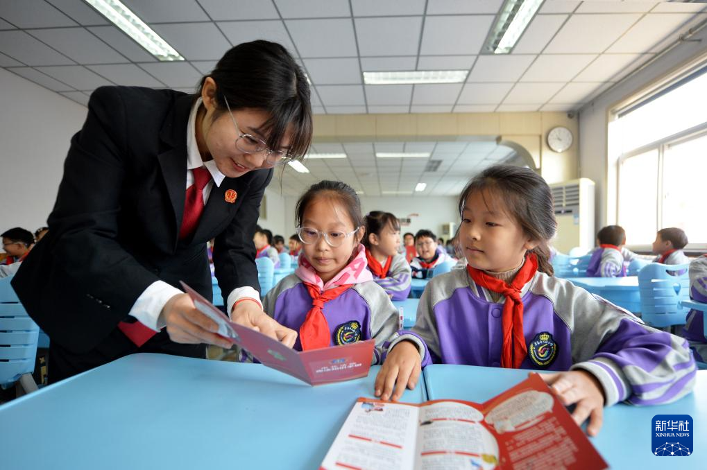12月3日,在山東青島壽光路小學開展的憲法知識進校園活動上,法官在指導(dǎo)學生學習憲法知識。
