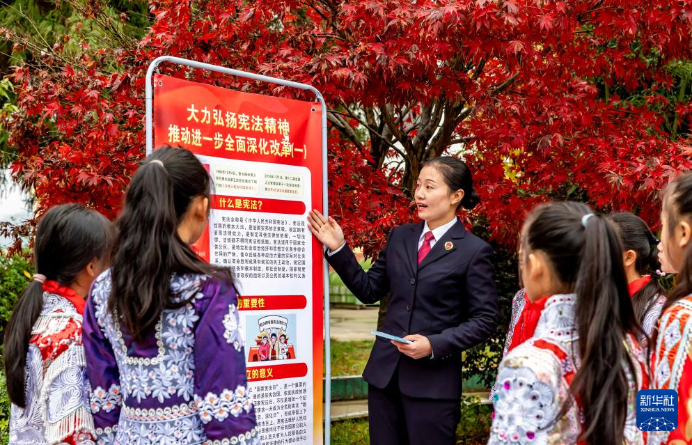 12月3日,貴州省黔西市人民檢察院的檢察干警在新仁苗族鄉(xiāng)化竹小學為學生普及憲法知識。