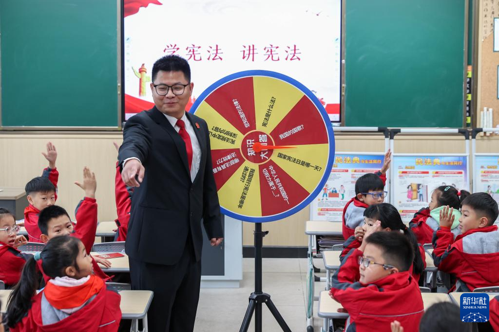 12月3日,在浙江省湖州市德清縣雷甸鎮(zhèn)中心小學,德清縣人民法院雷甸人民法庭工作人員通過知識大轉(zhuǎn)盤為學生普及憲法知識。