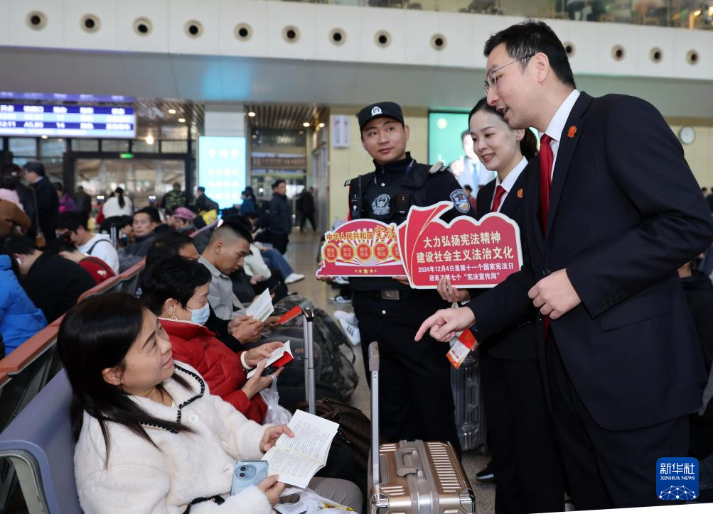 12月3日,武漢鐵路運輸中級法院法官在武漢火車站為旅客宣傳憲法知識。