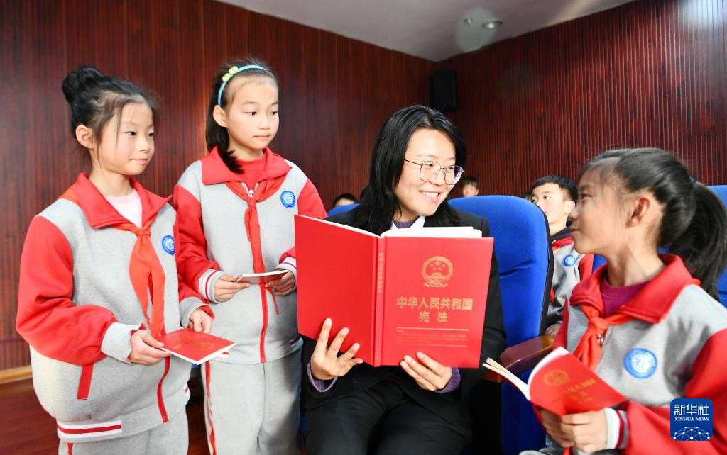 12月3日,在四川省達州市通川區(qū)羅江鎮(zhèn)魏興實驗學校,普法志愿者給學生講解憲法知識。