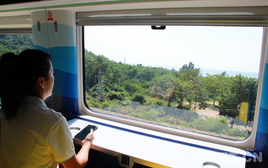 圖為三樂(lè)旅游鐵路列車(chē)“活力海洋”主題車(chē)廂,座位面朝大海,乘客隔窗可見(jiàn)海南三亞著名的天涯海角景區(qū) 攝影:劉莉